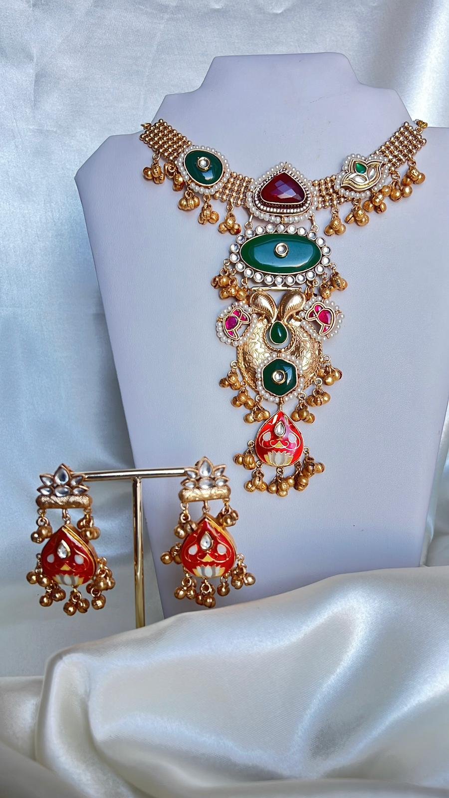 The Kundan Heritage Necklace 4 is a magnificent piece that perfectly embodies the opulence and artistry of traditional Kundan jewelry. This necklace combines the historical elegance of Kundan work—where carefully cut, polished gemstones are set into a fine metallic foil—with a design that celebrates South Asian heritage.