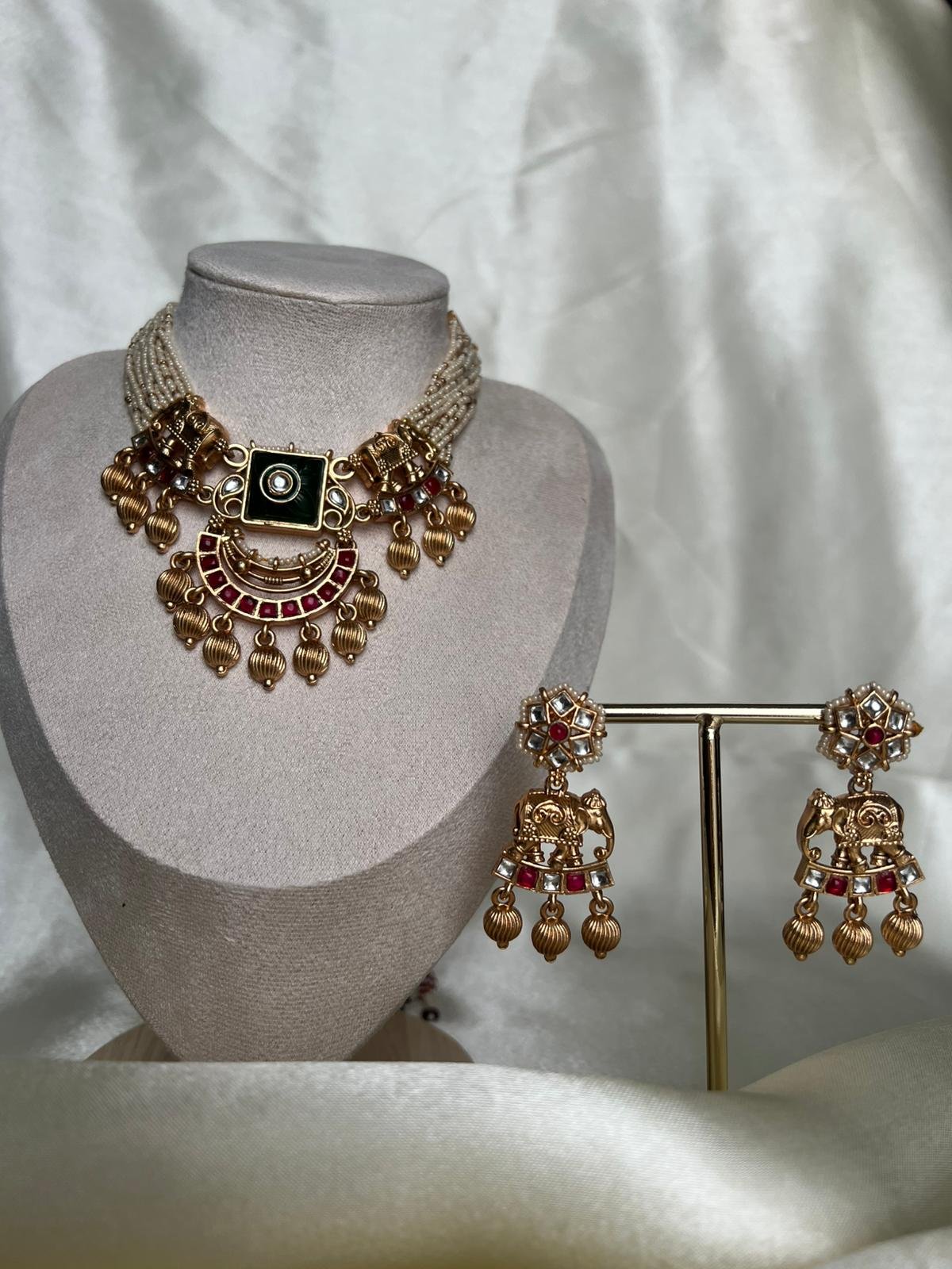The Kundan Set 5 is an attractive and modestly priced piece from the Kundan collection, embodying the traditional look of uncut stone jewelry. This set is crafted from a durable base metal finished with a classic gold-tone polish. It prominently features simulated Kundan stones, which are often polished glass or acrylic gems set using the traditional Kundan technique—a precise setting process involving foil beneath the stones to enhance their reflective quality and deep luster.