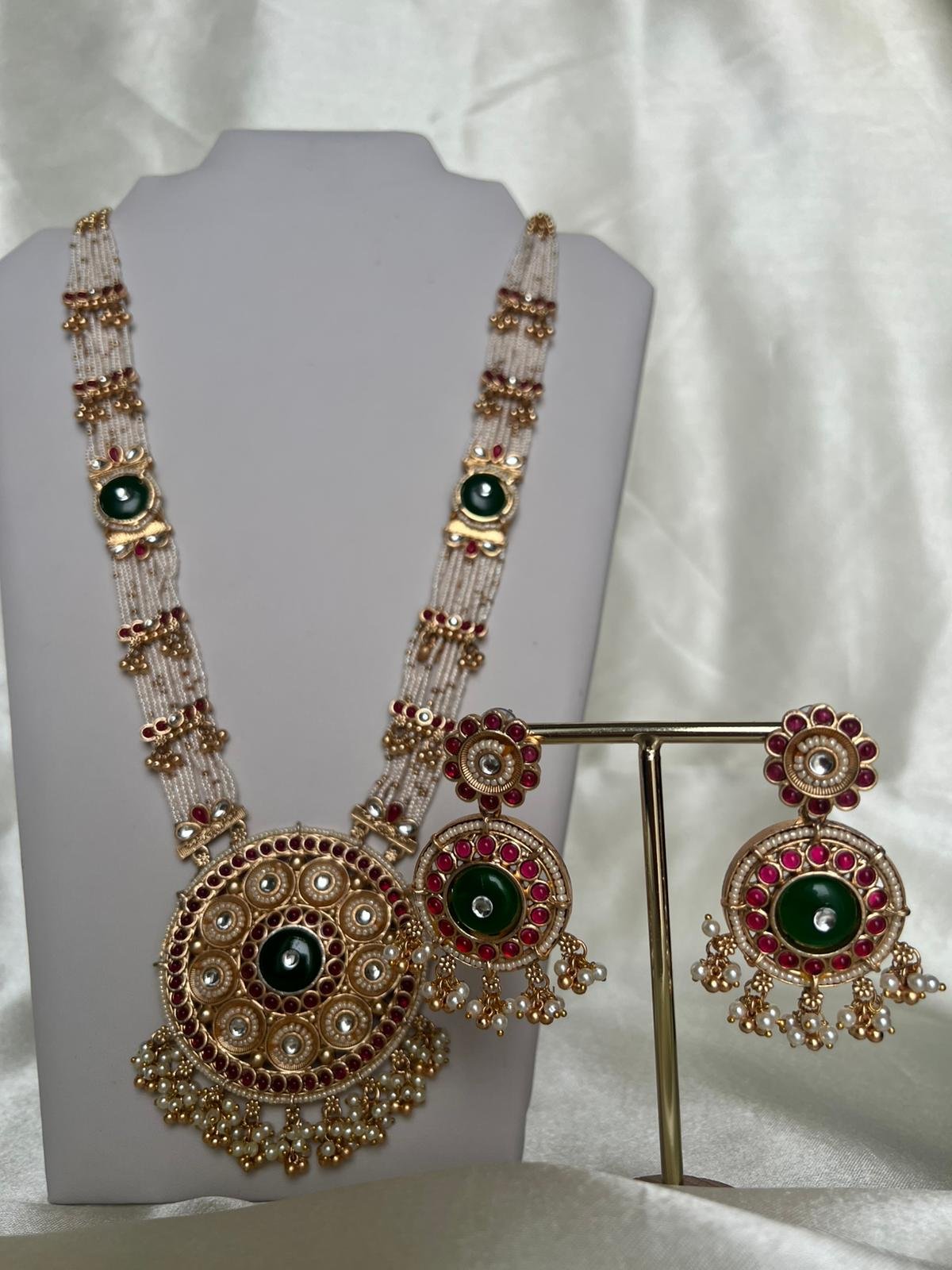 This set comprises a coordinating necklace and a pair of matching earrings. The design often incorporates intricate patterns and may feature subtle accents of color, such as faux pearls or colored beads, giving it a vibrant yet classic appeal. The medium size of the set makes it versatile—suitable for dressing up for festivals and weddings, or adding traditional glamour to more understated formal occasions.