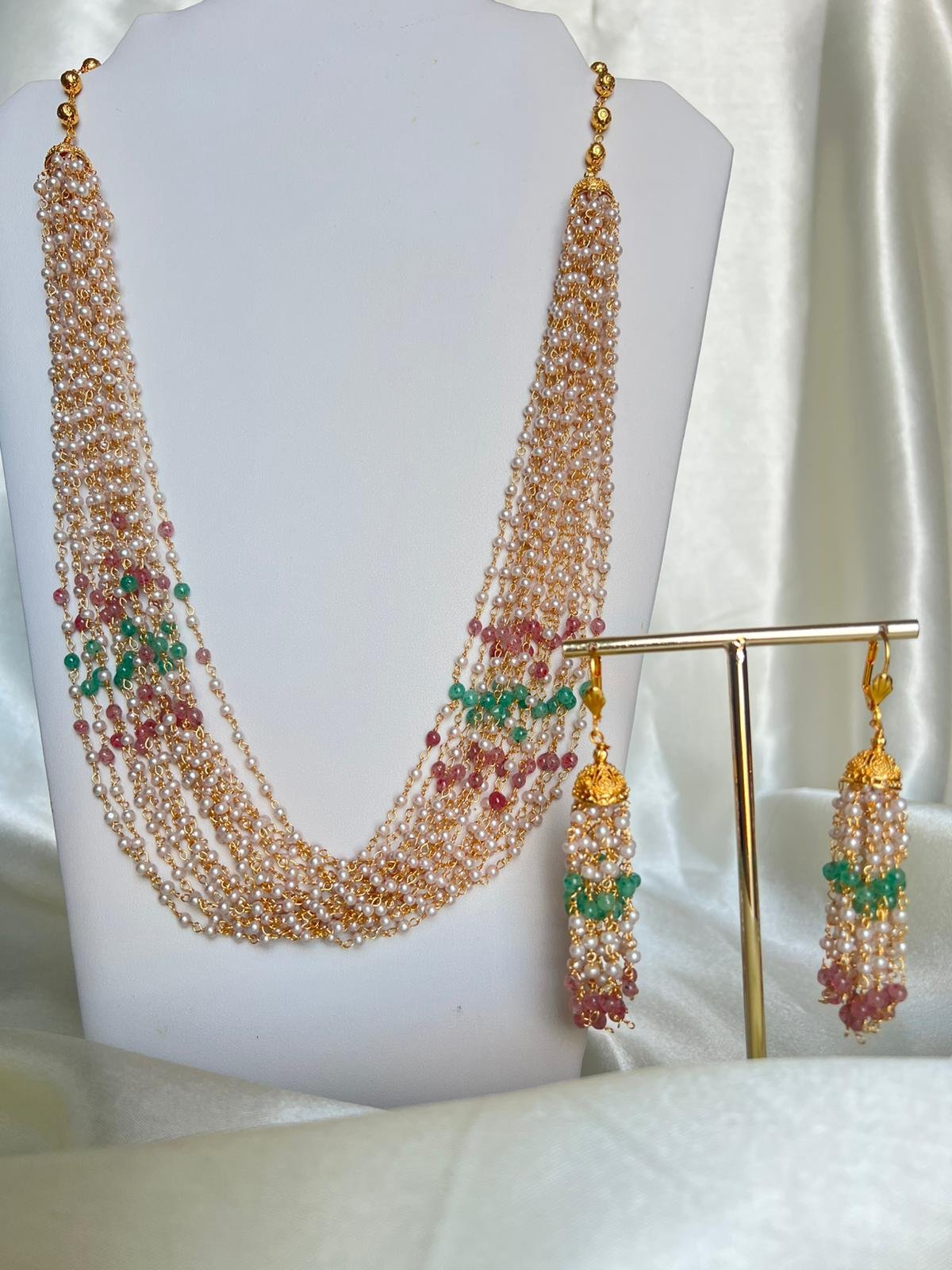 The Malai 1 is a stunning, multi-layered long necklace that makes a sophisticated statement. This piece features an impressive 16 individual strands meticulously crafted with high-quality beads in a refined palette of crisp white and delicate pastel colors.