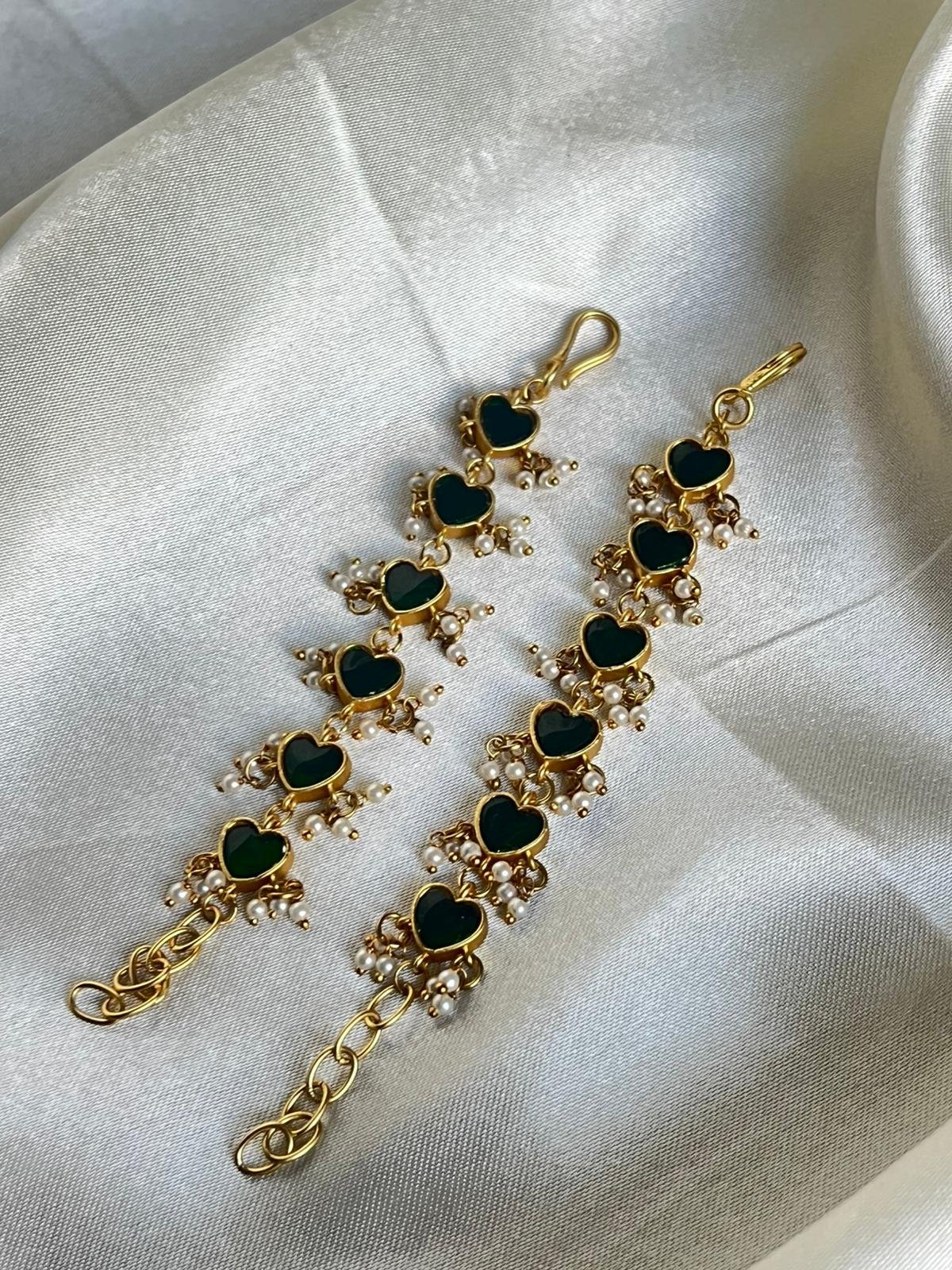 Adorn your traditional look with this breathtaking “Pearl 2” single-strand Mattil (hair accessory). This exquisite piece is a stunning showcase of unique floral Kundan Jadau work, featuring vibrant red and green stone accents. The elegant single chain is completed with lustrous white pearls, creating a piece that is both traditional and sophisticated. Perfect for adding a touch of royal grace and secure elegance to your bridal or festive hairstyle.
