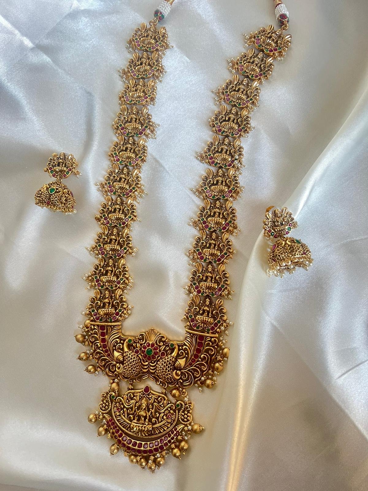The Premium Temple Laxmi Haram 1 is a distinguished long necklace (Haram) crafted in the traditional Temple Jewelry style, which is highly revered in South Indian culture.